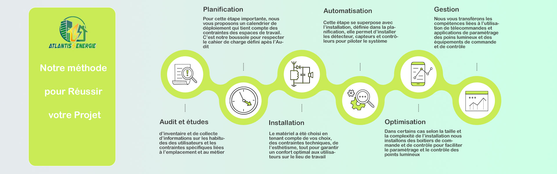Atlantis Energie, engagée dans la transition énergétique est un spécialiste de l’installation de systèmes lumineux ou le remplacement d’anciens systèmes par des équipements lumineux LED à haute performance énergétique.